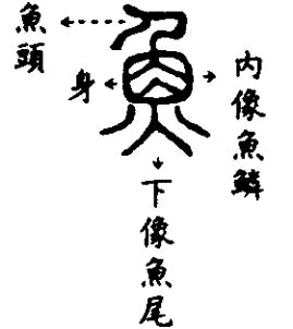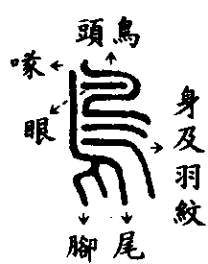 | 作禽類的通稱字形像鳥側立之形,上像頭眼喙,中像其身下像尾巴與腳 | 說文釋為「水蟲」就是水產動物的意思字形上像魚頭中像其身與鱗,兩側像鰭,下像其尾 |