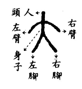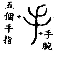 說文釋為「拳也」其實以形而言,應是人手字形像五個手指張開連著腕部的樣子 | 說文釋為「天大. 地大.人亦大焉」這是引伸義,本義是「人」字形像人正面張開手臂跨立的樣子 |