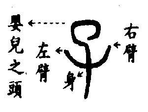 作「嬰兒」講,像嬰兒的頭.背.身.腳的樣子兩隻腳省作一隻腳,是因嬰兒在襁褓之中,兩隻腳相併的緣故.而手臂不省, 是因嬰兒喜歡揮舞雙手,據具體實像造字.
