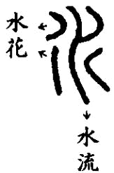 | 說文釋為「準也」準與水是音訓,也因水是最平的東西,可作測量的標準.字形中像水流,兩側像水花.或曰中像主流, |