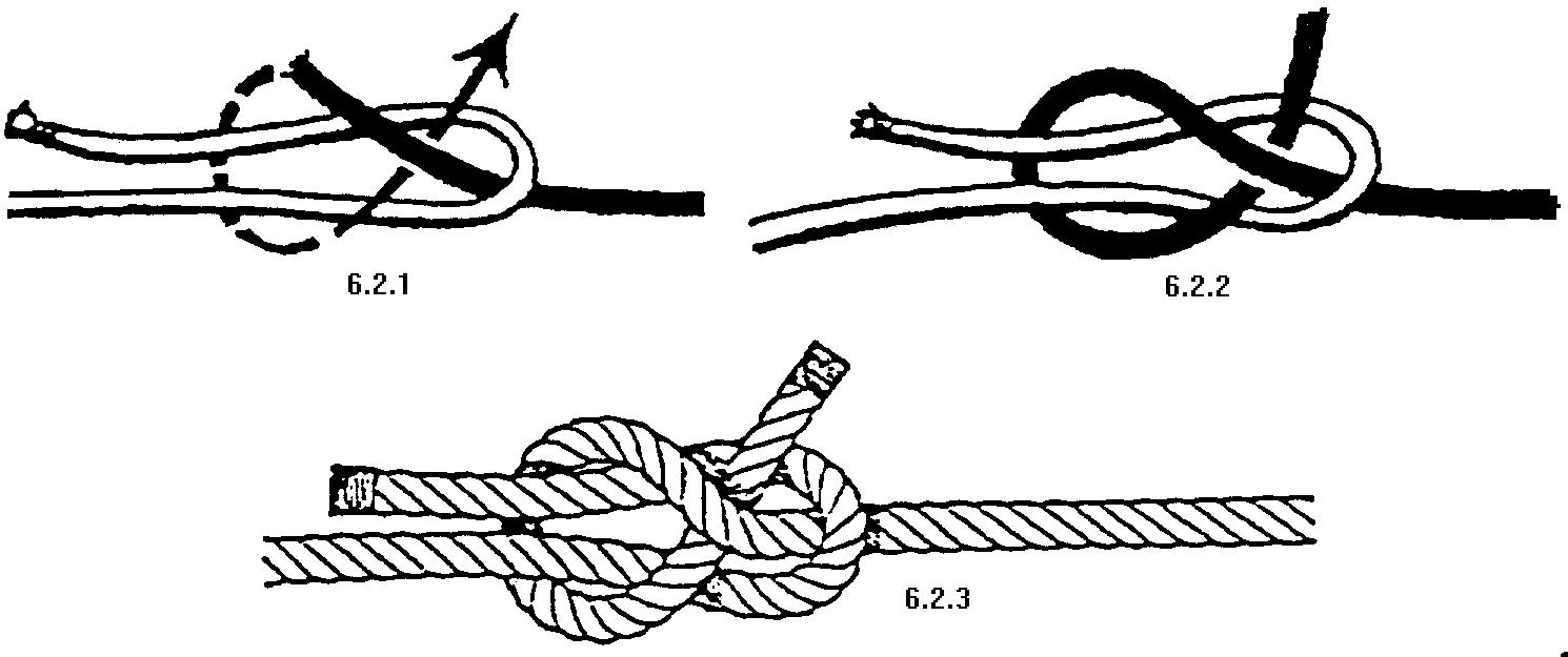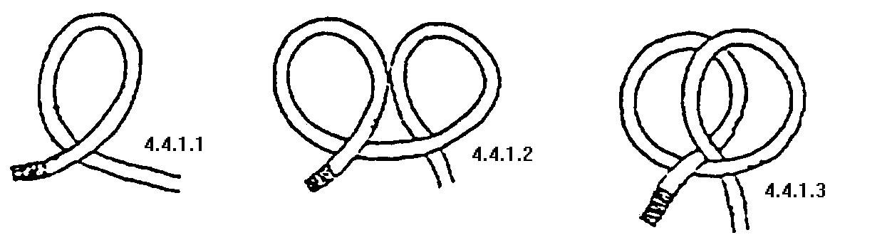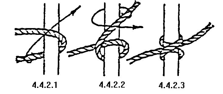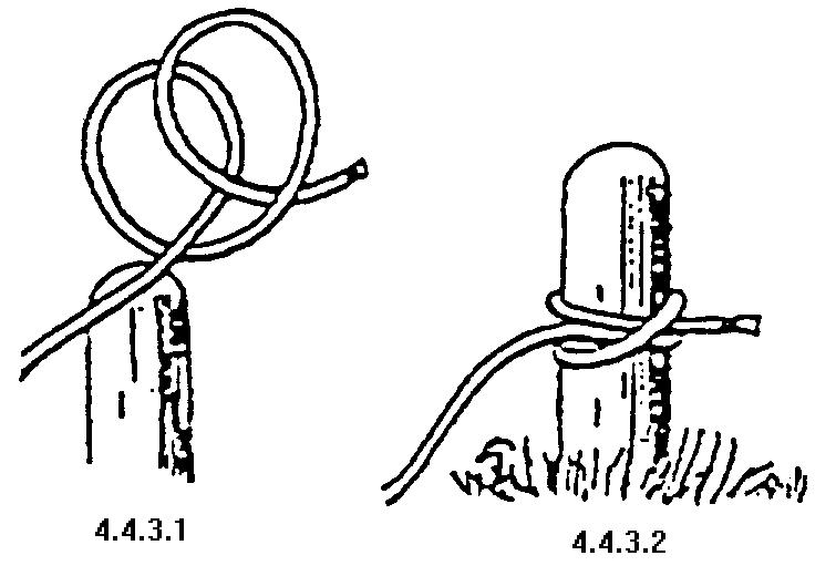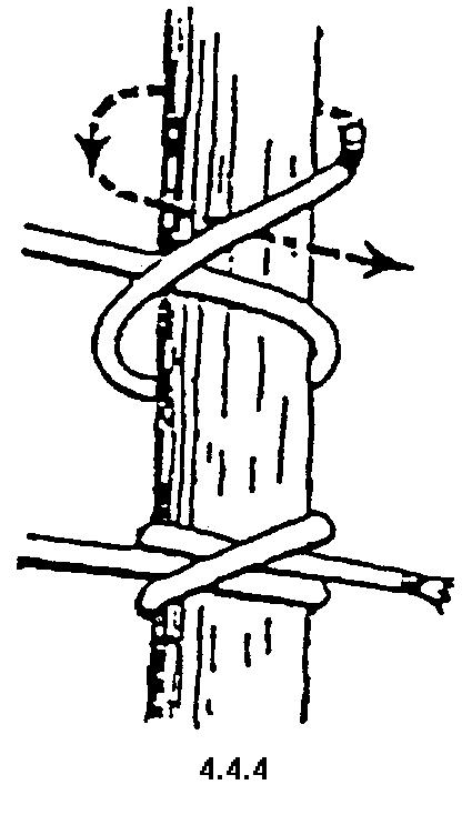 圖 4.4.1.1 及 4.4.1.2 所示的,是把繩身在柱中圍繞兩次,然後把繩頭穿過其中一圈,如箭咀所示。 圖 4.4.1.3 就是完成後的樣子。
