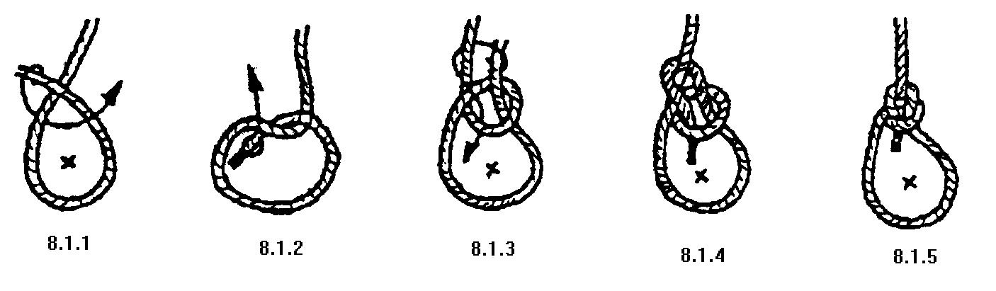 圖 8.1.1 所示的結法,可用來圍繞在自己的身上,圖中(X)的地方為身體的位置,以右手綑綁。這結法是最常用的方法, 為了容易記憶起見,人們特作了以下的故事記之: