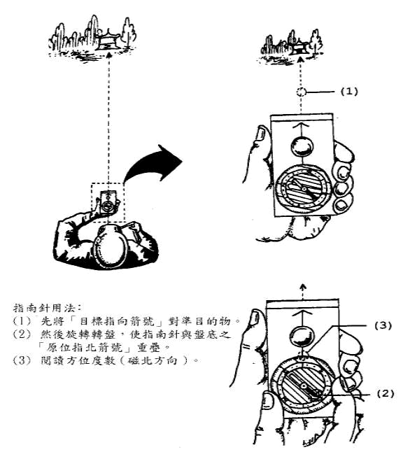 當我們要在實地測度目標方位時,便需用指南針,方法如下: