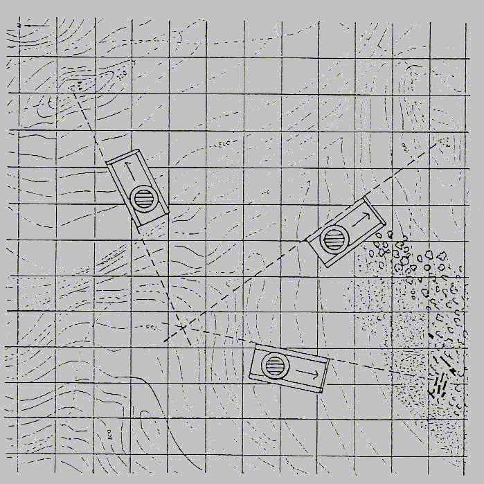 若己知自己所行之路線,如小徑,小丘,及山脊上等。就可利用附近的景物,測量其方位,便可在地圖劃線找出位置,方法如下: