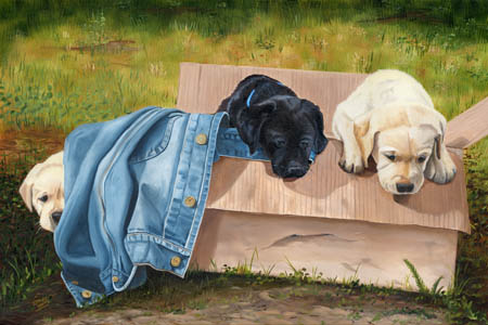 Canadian artist Lesley White painted our puppies and submitted her oil painting titled "You Go First" to Ducks Unlimited and it was selected as one of their 2008 DU Prints. We are so proud. The pups are Piper, Kuma and Whisky from Shammi's last litter. You can contact Lesley at www.oilsbylesley.com if you would like to support DU and purchase this limited edition print