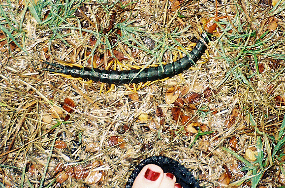 | One of the myriapod giants of Texas, Scolopendra heros, which I believe is Latin for “huge f**king centipede.” It’s powerful jaws can deliver a venomous bite that can kill other small animals and full-grown snakes. It is supposed to be very painful, a theory I won’t be testing, despite inserting foot into photo for scale and then backing away, hehe… |