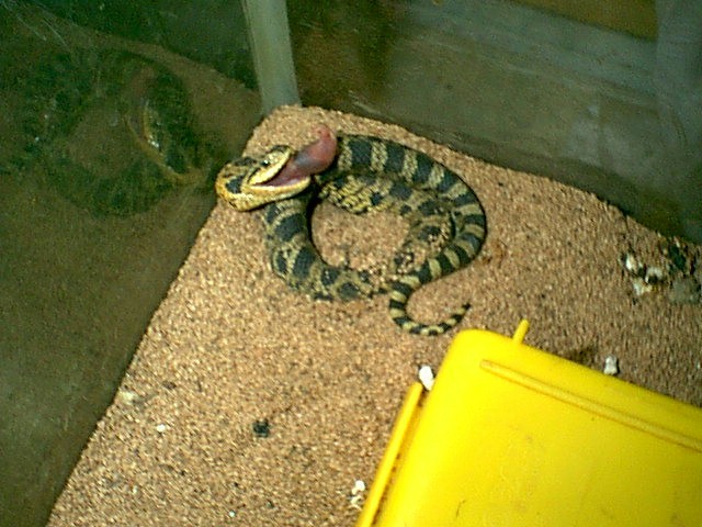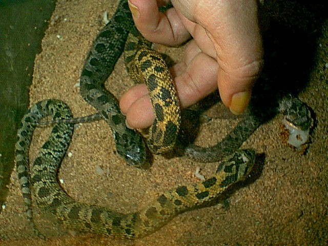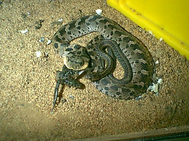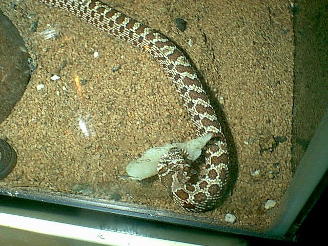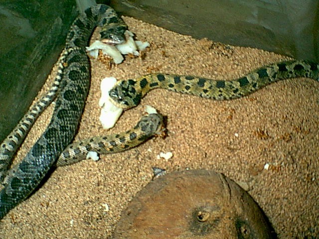 | These photos are Western and Eastern hognose snakes eating trout fillet pieces. Taken January 2, 2001 by J. McGavin |