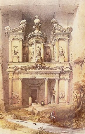 Его два этажа полностью вырублены в скале. В нижнем этаже соединены набатейские и классические архитектурные элементы, например, тимпаны в верхней части колонн и капители коринфского типа; в центре верхнего этажа – круглая башенка, украшенная статуями с конической крышей. «Эль-Хасне Фарун» означает «Сокровищница Фараона»: история названия вероятно восходит к древней легенде, согласно которой грабители скрыли здесь клад, но когда стали его делить, поссорились и перестреляли друг друга. Следы пуль, которые видны на фасаде, казалось бы подтверждают эту историю.