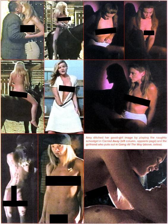 In 1996, Amy took it all off in Carried Away (above, below left column) as Catherine, an adventurous student. Dennis Hopper plays her teacher, Joseph Svenden, a middle-aged widower who falls for this blonde Lolita. Catherine pays a visit to Joseph's farm, where she strips down, masturbates, rides the horses bareback and gives Joseph the ride of his life.