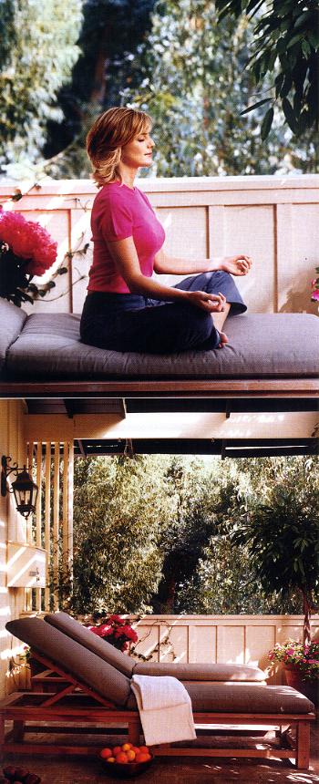 leather and grace Thorne-Smith's tufted leather ottoman is her designer's own creation; Ethan Allen's upholstered ottoman is similar ($639; 800-228-9229). Striped drapery fabric is Pierre by Scalamandré and is hung on cast-iron rods by Murray's Iron Works (finials, $188 each; 22-foot rod, $704; 310-289-3587). Thorne-Smith's velvet pillows and chenille-tassel pillows were custom-made; we found similar crushed velvet pillows at ABC Carpet & Home ($195 each; 212-473-3000).