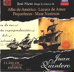 Until recent times, the profession of film composer was excluded and little or anything valued. Has had to pass time so the work of authors as Max Steiner, Alfred Newman, Miklós Rózsa or Bernard Herrmann, created for the big Hollywood studios, have been valued in their true measure. Deluxe editions of their works have helped to its deserved diffusion and to create an entire legion of fans and admirers that day by day it grows and multiplies, ending up in some cases to be true experts in the matter. Unfortunately, the Spanish composers have not still known that recognition; ignored by the media, their work has always been in the dark room. But all that ignorance will change thanks to the work and zeal of José Nieto, the most famous Spanish film composer nowadays, which has searched for Juan Quintero's forgotten manuscripts, author to whom is devoted this first volume, and who had his time of splendor in the time of the CIFESA studio, providing us a true jewel of the gender. Without changing a single note from the original, and in suites, Nieto has intertwined four titles from this master, possibly the more representative of a cardboard stone and patriotic cinema that met its best times fifty years ago. Juan Quintero's style is suspicious, but wisely similar to that of a Max Steiner in his more dramatic moments; themes as the main one of Locura de Amor (1947), makes us imagine what may had happened with this little spanish man if, as with the europeans mentioned before, had migrate to Hollywood, and his spectacular orchestration together with the patriotic choirs gave us a beutiful work of strongly dramatic and lyric nature. With Pequeñeces (1949) he created a juvenile cheerful melody, with a beautiful waltz worthy of the own Steiner, and for Mare Nostrum (1948) it recaptures his dramatic airs without the choirs for the only time in the CD. The disk concludes with Alba de America (1951), where a strong epic sense takes the reins of a score that oozes greatness in spite of that patriotic air that characterized the spanish productions of the time. In definitive, we are in front of a very valuable sample of the work of one of the most important and fertile spanish film composers whose filmography comes perfectly pointed out chronologically in the CD booklet. Quintero died in 1980 without having seen recognized his work as artist, and today has been made justice with this luxurious edition. Let us hope that the fan, who has the last word, will support this perfunctory and therefore necessary work of rescue, and that we may continue enjoying successive volumes, something similar to what in the seventies made Charles Gerhardt with the Hollywood classics. Congratulations! R.M.M.