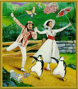 After cleaning up the toyroom, Mary takes Jane and Michael out for a walk and they meet Bert. The four of them jump into the chalk pavement picture that Bert has drawn and Mary and Bert have a "Jolly Holiday" dancing with penguins.