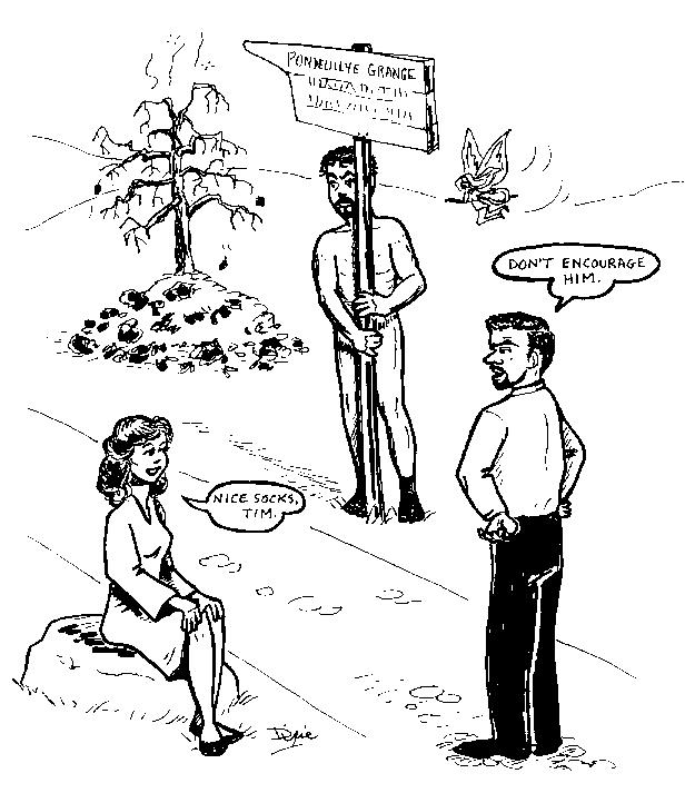 Winged Thing, hearing his cue, flutters out of the grove of trees and alights