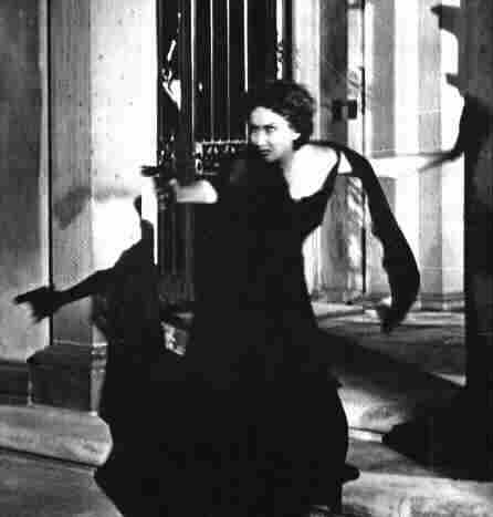 descends the long staircase of her house, facing the cameras. Newsreel
