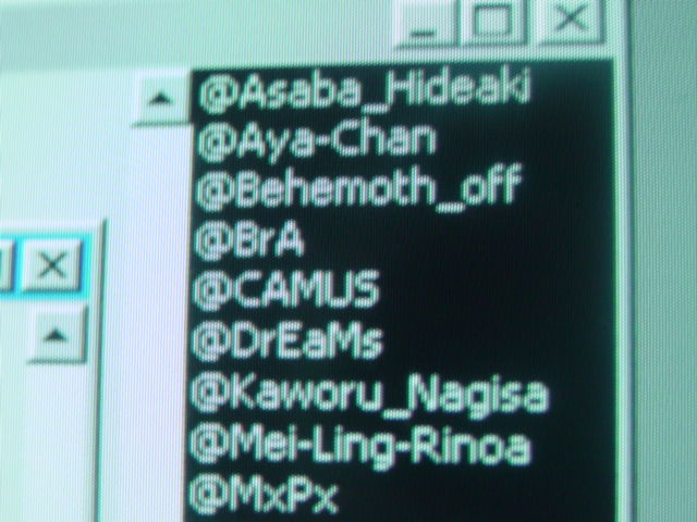 | Como pueden apreciar ellas disfrutan del chat todas las noches , ya que poseen un computador en sus naves. Se meten al conocido chat llamado mIRC al canal Gokuraku donde conversan y webean . Aqui en la foto de arriba muestra algunos de los nombres de la gente que se mete. Ellas son las octavas en la lista. |
