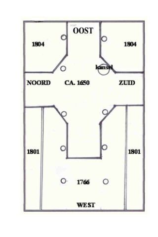 Eén daarvan was de "centraalbouw"; nl. een gebouw met een ronde, achthoekige of kruisvormige plattegrond. Veelal staat midden op de koepel of de kruising der daken een klokketorentje, zoals dat op de nieuwe kerk in Groningen, de Grote Kerk te Coevorden en de Noorderkerk te Amsterdam nog te zien is. De kerk ligt midden op een vierkant of rechthoekig kerkhof, welke aan vier zijden van toegangen is voorzien.De bouw van de kerk vanaf 1651 liep niet zo voorspoedig. Alle fondsen die terbeschikking waren, zelfs de "armenpenning" werden in het bouwwerk gestoken. In 1660 ontbraken nog de vloer en de ramen en men noemde de kerk een "waar duivenhok". Pas in 1664 was hij in enigszins bruikbare toestand. Deze kerk bood plaats aan ± 500 personen. De preekstoel stond aan een schuine zijde tussen 2 kruisarmen en wel aan de zuidoostzijde. Rondom de preekstoel was een doophek aangebracht.