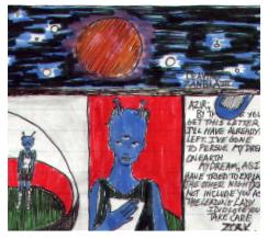 | In 1994, while many lonesome hours were spent in my DC apartment, I began to create a rock opera. It evolved into a series of songs, all basic rock n' roll. Later, 1996, I drew a comic book that illustrated some of the adventures of my alien character, AZIR FROM ZANBLA III. |