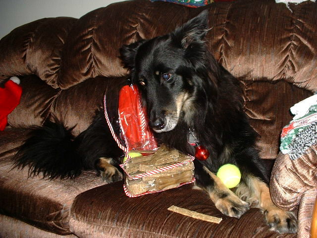 This is my dog Butch. Isn't he cute? He's 10 years old and thinks he's a human. *Note all the presents we gave him at Christmas* |