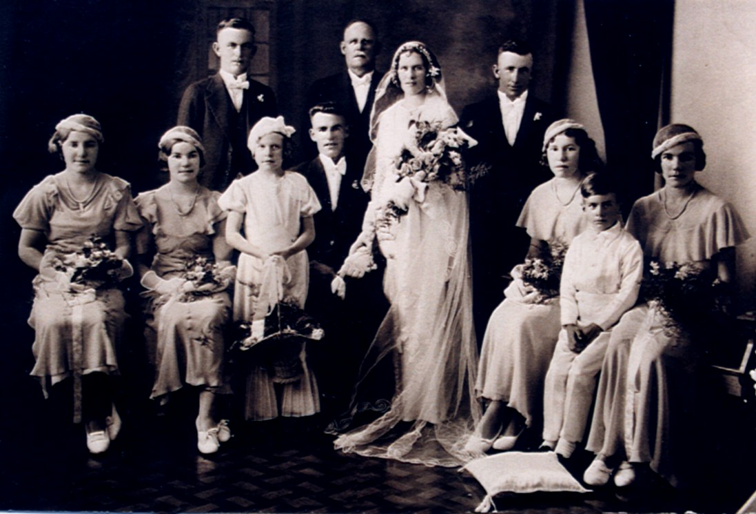 | Wedding Party L to R Standing Arthur Stringer; James A Hornery; Pearl Hornery; Cyril Power Seated L to R Bridesmaids: Rita Rowland; Doris Rowland; Flowergirl: Mabel Stringer; Groom: Fred Rowland; Bridesmaid: Clara Rowland; Pageboy: Norman William (Bill) Walmsley; and Bridesmaid: Edna Rowland. |