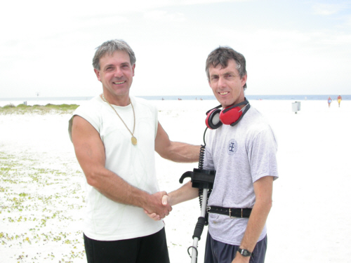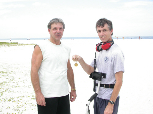 After about 5 min I got my first hit. A pull-tab of course. This was followed by another pull-tab, 2 quarters, and three pennies. Will was having problems with the Excalibur that had been borrowed from Frank Hansen the night before. He was about to go get his Sovereign that was still in the car. Jim was out as far as he could get without giving his Sovereign a salt-water bath. Lottci was using Jims old Garrett XL500. This was his 1st day with a detector, a trial by fire for Lottci. After about 30 min the batteries on the XL500 gave up, Jim forgot to put them on charge the night before. So Lottci just sat depressed on the beach, hoping, (praying?) that one of us would get lucky. We had been in the water for a little over an hour and a half. Jim was still in the same basic area Lottci had shown him. Will had moved closer the shore. I was beginning to think we were too late. Maybe another detectorist had lucked into the area and made off with our treasure. Lottci had checked with the hotel, but nothing had been turned in or reported found. So I decided to move away from the original area. I looked at the beach area an noticed they raked the sand at night to clean the beach. All the chairs were on one half. Lottci was using the position of these chairs as a reference of the coins possible location. Maybe they move them all side to side at night to clean that area of the beach? So I moved with the current down about 50 yards. Thinking that this might be the area were the chairs were the day of the loss. 1st target? Another pull-tab of course. I was in 3 ft of water. Then I got a good hit. I tried to get the target with the first scoop. I rechecked the target area and it was still there. Even thought this was the gulf coast and very calm as compared to our east coast, I was having problems staying in one spot. The waves had picked up and being of small (thin) stature, I was getting pushed around. I tried again for the target with the scoop. Checking the target area, no sound, I must have it in the scoop. Boy did I have it; Looking down in the scoop was the biggest pile of gold I had ever seen!