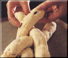 When dough is punched down after first rising, turn out onto a lightly floured surface and divide into six equal portions. Cover with towel; let rest 10 minutes. Roll each portion into a ball. Roll each ball into an evenly thick rope about 16 inches long. Line up three of the ropes, 1 inch apart, on a greased baking sheet. Starting in the middle, braid by bringing left rope underneath center rope, lay it down. Then bring right rope under new center rope; lay it down. Repeat to the end. On the other end, braid by bringing outside ropes alternately over center rope to center. (Braid the ropes loosely so the bread has room to expand.) Press rope ends together to seal. Repeat braiding with remaining three ropes. Let rise and bake as shown in the above Egg Bread recipe.