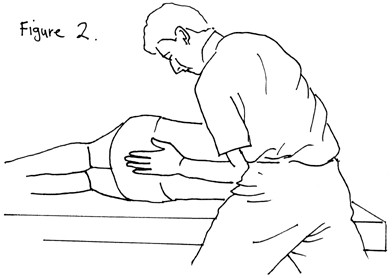 In this procedure the therapist is positioned behind the patient, facing the patient’s feet. Using a soft foam square for comfort and improved adhesion, the heel of the hand is placed on the lumbar spine centrally at the level of the intervertebral disc between the fourth and fifth lumbar vertebrae (L4/5). The supraspinous ligament is nestled between the therapist’s pisiform and trapezium. The therapist’s elbow is braced against the anterior superior iliac spine. For a left side-lying patient, the therapist is pushing with the right hand/right hip. For a right side-lying patient, the therapist is pushing with the left hand/left hip.