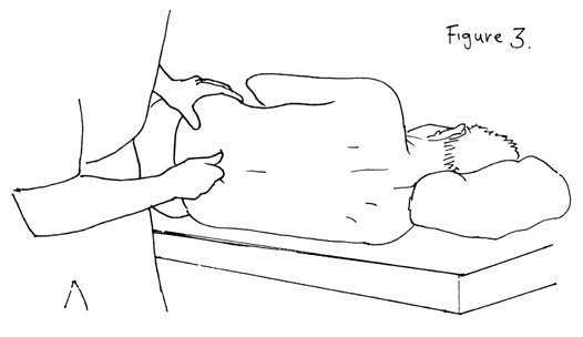 2. After traction, the patient’s pelvis is stabilised with the other hand, and extension mobilisations performed, again using a foam square for patient comfort. These mobilisations are in a postero-anterior plane, the force coming from the therapist’s free hand which is clenched into a fist and a V formed between the thumb and the flexed index finger as seen on figure 3 . The lumbar spinous process fits into the V and the force is transmitted to the articular pillars via the therapist’s horizontal forearm. If needed, the therapist can brace the elbow against the hip as described above, to increase stability and force. The extension mobilisations are performed at the level of L4/5 with the patient still in side lying. Five to six mobilisations will suffice. While it is wise to start with a gentle mobilisation, often there will be a surprising degree of pain free mobility of the segment and a stronger mobilisation causes no discomfort. Occasionally, these mobilisations are painful. If this happens, the traction is repeated and the pain should diminish.