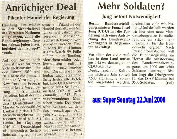 Machtbesessen wie Deutschland nun einmal ist, will man auf Teufel komm raus wieder eine tragende Rolle in der Weltpolitik spielen und unbedingt in der UNO gewichtig mitreden können, auch schon um die heimische Waffenindustrie mit Aufträgen versorgen zu können.Dazu ist jedes Mittel recht! Deutsche Soldaten in jedes nur sich bietende Kriesengebiet zu schicken, gleichzeitig scheinheilg zu jammern, dass Deutschland schon lange weit überfordert ist, was Kriegseinsätze betrifft, um ein paar Wochen später wieder nach noch mehr Soldaten zu rufen . Alles in Deutschland und mit Deutschen kein Problem, gestreng dem Motto: Am deutschen Wesen soll die Welt genesen!Hier sind sich fast alle Politiker einig, CDU, SPD, Gr�ne, und FDP-- obgleich die Mehrzahl der deutschen Bevölkerung dagegen zu sein scheint, interessiert das unsere einmal gew�hlten Politiker nicht im Geringsten! Wie zu erwarten:Die Reaktion der ach so "mündigen Bürger"? Ruhe ist des B�rgers erste Pflicht!Die Pflicht Nr. zwei? Alles möglichst schnell vergessen und nichts hinterfragen. Hauptsache, mir ...., ich ......, ich ....!!! |