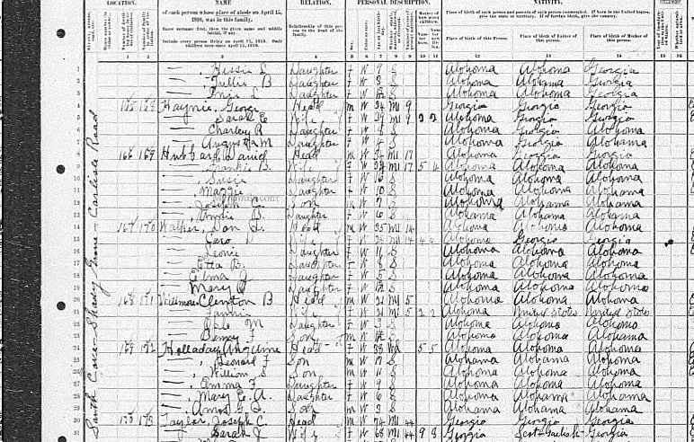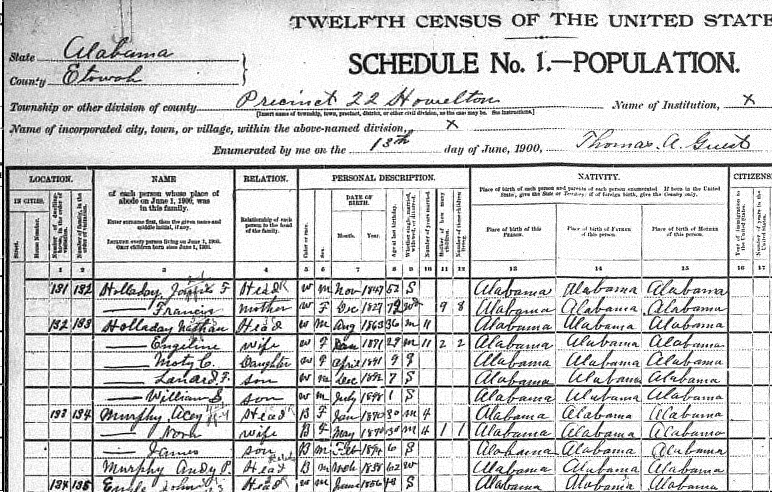 Angeline and Nathan in the 1900 Census. Etowah Co Alabama ED160 Sheet 8B. Cold Creek, Howelton Area