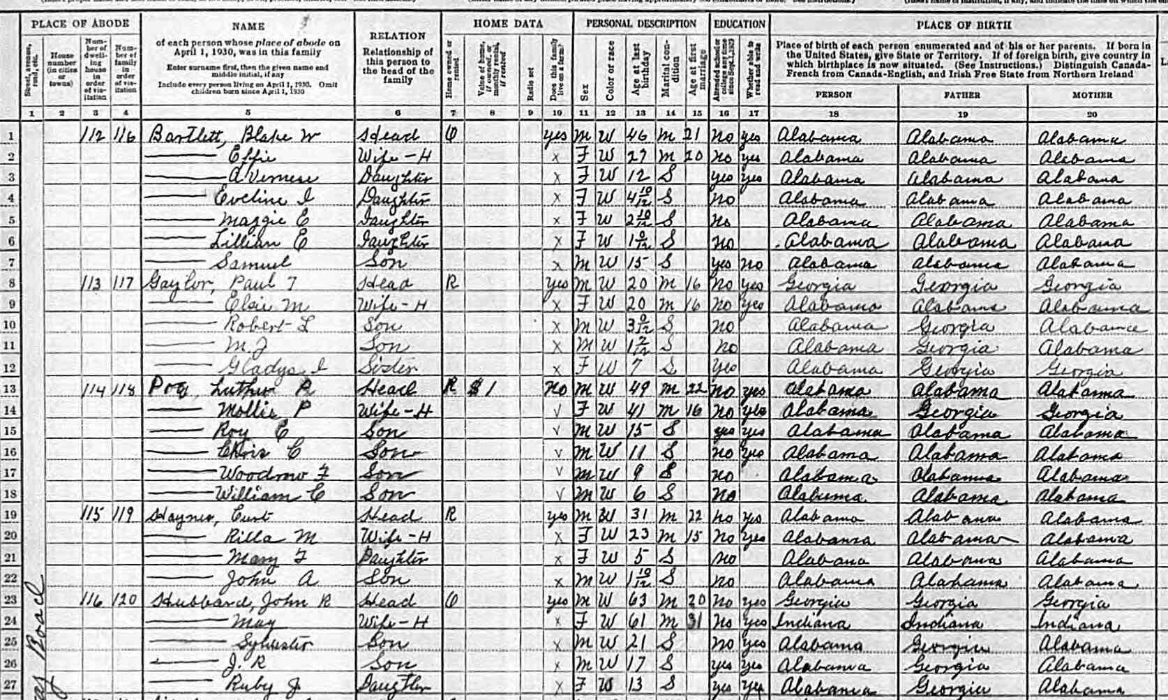 1930 census ED Alabama, Etowah, Aurora Sheet