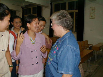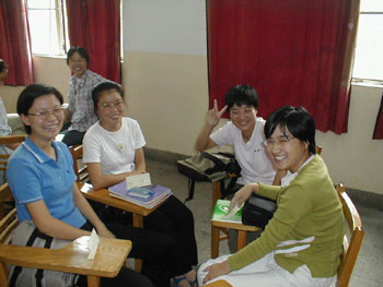 "They are eager to know English," says the newly designated head of the English Department, Ms. Zhang Lei Feng, "but it takes hard work and that discourages them. So be strict with them, not democratic like you are in the US."