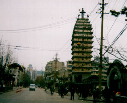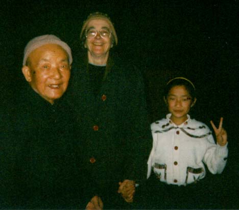 | Pagoda in Kunming, YunNan's capital, built in the 800s. When Anne was a girl, this was the view from her home, which was just to the right of the picture. | Mr. Henry Woo, and granddaughter, near their home at Kunming University. Woo had been a colleague of Anne's father in the early 1940s, establishing a middle school for minority students. |