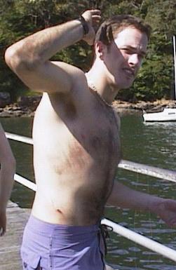 | This is Rabbi Jim Gregovski, chairman of Jim's Mowing and head grass cutter. The good Rabbi is a well established and particularly skilled grass cutter and is known for his ability to cut grass in any location and at any time of the day or year. As manager of Hyena Records I have had my grass cut by the Rabbi on more than one occasion and I'm sure The Kiwi Chick and Chizza can vouch for the quality of his work. Rabbi G (as he's known in Miranda) fancy's himself as a bit of a buff kunt and as a result he has been seen on many occasions endorsing fagwear. He is featured below both with and without his fagwear, unfortunately the later does not adequately show his incredibly massive growth of back hair. It does however show injuries he acquired while falling of his pushbike, pissed. That'll teach you not to ride without a seat ! |