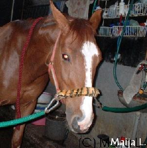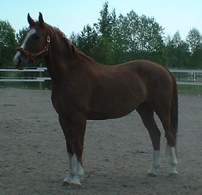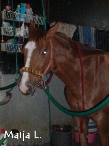 | Ville on yleensä suht helppo käsitellä, mutta joskus temperamentti kuohahtaa, joten on ihan syytä vähän pitää silmällä Villeä. Usein se on melko rauhaton, ei tahtoisi millään pysyä paikoillaan. Hoitamiseen Ville suhtautuu ihan kivasti, mutta silti on syytä sitoa se kiinni tai harjata käytävällä ketjuissa koska se ei tosiaan tahdo pysyä paikoillaan. Yleensä harjaamiset ja muut ovat merkki siitä, että kohta päästään ulos ja menemään, niin eihän sitä malttaisi olla paikoillaan. Ulkoa tullessa ja varsinkin ratsastuksen tai juoksutuksen jälkeen Ville ottaa rauhallisemmin. Eräs huomioitava asia on se, että Ville on kovin herkkä päästään, kaikin tavoin. Pään harjaamisessa on oltava hyvin varovainen ja se on tehtävä pehmeällä harjalla. Suitsien tai riimun laitto on tehtävä rauhallisesti, Villellä on nimittäin pitkä kaula, jonka avulla pään saa helposti katonrajaan ihmisten tavoittamattomiin jos tarve vaatii. Ja vieraiden ihmisten on turha kuvitellakaan paijaavansa Villen päätä, kaulaa kyllä saa taputtaa, mutta päähän ei ole koskemista kuin tutuilla. Kovin helppoa Villellä ratsastaminen ei kuitenkaan ole, vaikka se aika rauhallinen onkin. Sillä on nimittäin paha taipumus lintsata milloin vain mahdollista ja tehdä asiat vähän sinne päin. Ratsastajan on siis oltava tarkkana koko ajan. Villeä ei nimittäin saa päästää kuin koira veräjästä tässä asiassa, sillä menolla se vain oppii ettei ratsastajaa tarvitse niin kovin tarkasti kuunnella. Onpa sitä monet kerrat tullut treenatuksi esimerkiksi kulman ratsastamista muutamaan kertaan... Ville ei loista kisakentillä isänsä tavoin, se on aika keskivertoratsu sitten loppupeleissä. Tämä näkyy kisakalenterissa, sijoitukset kolmen joukkoon ovat harvassa, mutta Ville tekee sellaista tasaisen hyvää jälkeä kaikissa kisoissa. Joskus se riittää sijoitukseen, joskus sillä jäädään häntäpäähän. Juuri tasaisuutensa ansiosta Ville on kuitenkin luottoratsuni kilpailuissa: kun tähtihevoset pettävät, niin Ville senkuin porskuttaa. © Marinka |