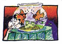 ![]() One afternoon, while little sister and the cat were sitting together on the living room couch, the gold fish decided the time to act had come. They swam as fast as they could round and round the bowl until together they leaped clear into the air! Many things happened at once. The gold fish found out there were no other fish on the floor where they landed. The cat rushed over from the couch and joyfully tasted one of the gold fish with the tip of his tounge. Little sister right behind the cat scooped up the gold fish in each hand, and held them gently for a moment. Then she put them plop! back into the bowl. Everybody got their wishes that afternoon and nobody got in trouble. Not even the gold fish. But the cat always wondered if the other gold fish wouldn't have tasted just a little bit better...