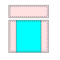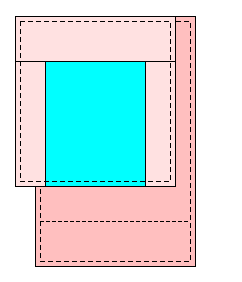 | First start by piecing together the top layer. Here are three rectangles of body fabric and one rectancle of fancy fabric, with a seam allowance all the way around. (Seam allowance is shown as dashed lines.) |
