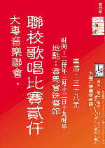 Joint University Singing Contest 2000. 12th March 2000 (Sunday) 得獎名單: Solo 獨唱 Group 合唱 冠軍 : 蕭乃志 香港大學 965000 香港樹仁學院 亞軍 : 謝家麒 香港城市大學 崔敏萍 張秀薇 香港城市大學 季軍 : 黃雲妮 嶺南大學 黃嘉穎 袁思慧 香港理工大學 地點: 香港理工大學 賽馬會綜藝館 日期: 2000 年 3 月 12 日 時間: 7:30pm to 10:30pm 表演嘉賓:江華+Tat
