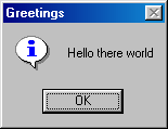 For example: MsgBox "Hello there world", vbInformation , "Greetings"