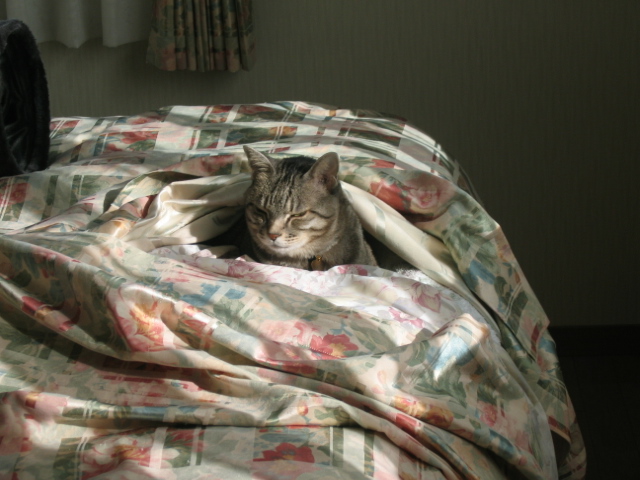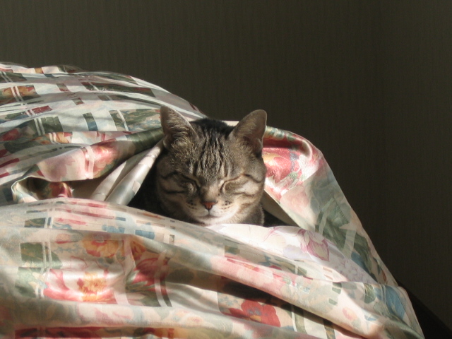 In other behaviour, domestic cats treat their humans like they did their mothers in kittenhood. That means no scratching or biting, and looking out for a share of any food on offer! Their territorial nature means that they can easily be trained to keep away from certain places - we didn't have much trouble dissuading our two from climbing into the butsudan, for instance. A loud voice, or a sharp tap on the nose, as cat mothers inflict, was quite enough sanction. On the other hand, it seems quite impossible to stop cats sampling food they come across on counter or table. Desert predators need to eat as much as they can at every opportunity that presents itself, for they may have to suffer long periods without. They just cannot understand that food may be available but forbidden! The only solution is to keep food out of their reach.