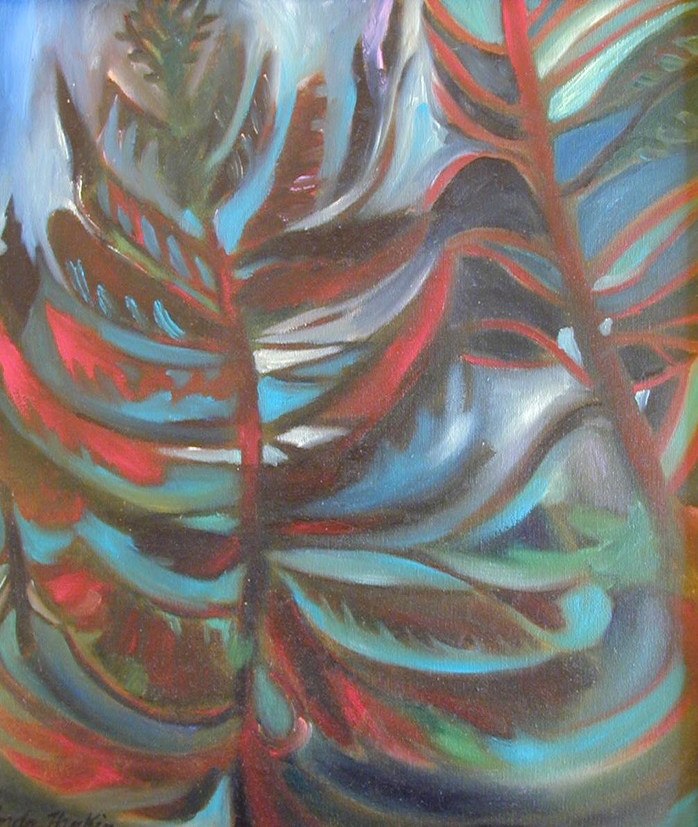 | Trees in front of the cabin in the Allegany Mountains, oil on canvas, 15 1/4"x18" by Linda Hankin $700. |