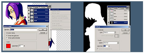 CTRL+SHIFT+I (invierte selección), en la paleta de capas selecciona la pestaña CANALES, crea un nuevo canal (ALFA), deja las opciones predeterminadas, y vé a EDICIÓN> RELLENAR> BLANCO.