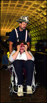 Hilary Yale, 15, covered with blood, is wheeled out of the Capitol Heights Metro station after being injured at a fight that broke out on the platform between two groups of teens.