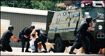 Michelle Green collapses in the arms of Montgomery County SWAT team members after she fled the office of a self-storage company where a lone gunman opened fire on the employees.