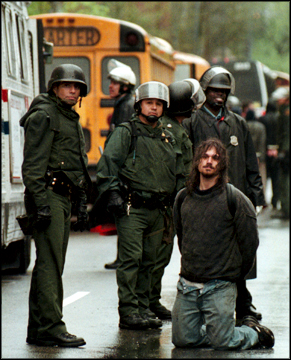 | A protester is guarded by members of the National Guard and the D.C. police while waiting to get on the bus that will take him and hundreds other protesters who got arrested outside the IMF Building. | |||||||||||||||||||||||