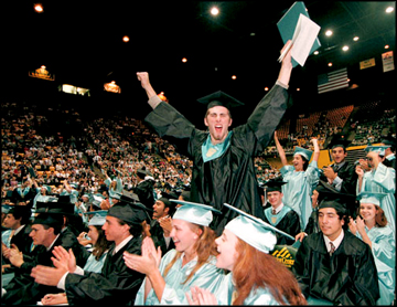 Centreville High School graduate James Frederick cheers as his classmate and Senior Class President Mark Armon delivers the farewell address at the school's graduation ceremony.