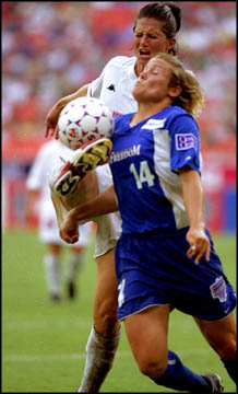 Carolina Courage forward Danielle Fotopoulos attempts a high kick as Washington Freedom midfielder Jen Grubb (14) try to clear the ball away.