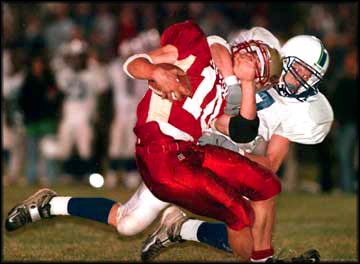 South Lakes High School defensive back Dustin Hellenga brings down Oakton's quarterback Tom Ridley at the goal line in the third quarter of a Friday night Seahawks' loss to the Cougars.