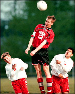 McLean's midfielder Will Colglizier goes up for the header between two Marshall defenders in the second half of the Partiot District quarterfinal match.