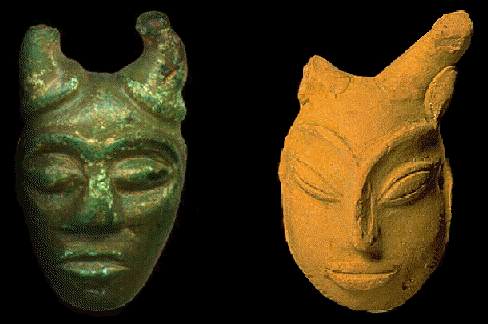 In the two faces below, both of which appear to have a meditative expression, the remarkable similarity in the depictions of Cernunnos and Pashupati can be seen. The Cernunnos face (on the left) is from Europe, whereas the Pashupati mask (on the right) is from the Indus Valley. These two facial depictions of the horned God, created thousands of years apart, display only one distinct difference; their racial features. The Cernunnos image displays facial features which are more commonly European, whereas the small Pashupati mask, which archaeologists believe may have been used as a talisman, shows features which appear more eastern.