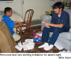 History In Fall 2003, Judith Osbual was the Alumni Secretary for the Alpha Phi Omega, Gamma Beta Chapter at San Jose State University. When I joined the Alumni Committee, it consisted of Judith, Ernie, Phi, Houng, Sharon , Isma, and I. Nino and Judith's cute little sister also contributed later. We spent many long nights at Judith and Phi's apartment (they name it "12th Wonder") planning Alumni Night. Isma went to Costco to buy and cook food, Phi made contacts, Ernie obtained alumni information, Sharon did addresses, Judith set the program and edited the alumni newsletter, and I, well, made phone calls and provided back up support for the secretary, such as going to the A.S. Print Shop and spending 26 dollars of my own money make copies of the newsletter. I did not ask for compensation partly because I was too lazy to ask for it, partly because I wanted to contribute to the alumni budget, and partly because It would take a very long time to get the money back. Isma also bought the food at her own expense.Days of effort resulted into the Sixth Semi-Annual Alumni Night on November 28, 2003. It was interesting to see former members of the club of various ages in one room. Judith programmed a tardy but informative show. Everyone had a good chance to learn about the alumni present. The Milpitas clubhouse was difficult to find and our parking was threatened by citations and tow trucks. Richwood's vehicle suffered damages. Fortunately, the alumni's achievements inspired Richwood to create a legacy that will survive future generations. With that in mind, he sought to become the next Alumni Secretary with Phi. In Spring 2004, Phi and I remained in the Alumni Committee as others replaced the ranks. they were Richwood, Reed (who attended the past Alumni Night) Mike Huen, and Christina Bose. This group was a little more interactive than the previous one probably because they had more spare time to meet together. Richwood was the executive and Phi was his left-hand woman making the connections and completing the schedule. Generally, we all were assigned roles and shared some tasks. Richwood assembled the newsletter and encourage The Seventh Semi-Annual Alumni Night was on March 13 at the University Room at SJSU. The attendance was higher than last semester, partly because of the proximity and partly because of Angelique's enthusiasm to rally the pledges there. Spartan Shops catered the event (because we had no choice) and the MOSAIC Cross-Cultural Center helped sponsor the event. Mike Huen was the Master of Ceremony (which he likes to brag about). For details, I wrote an account of that event here in Return of the Alumni. At the end of the Spring Semester, Phi and Richwood's tenure came to an end and both declined a re-nomination. When Richwood nominated me to succeed him, he did it for a reason. It was not like he opened his black book and randomly picked my name out of it. After all I went through, I was not surprised that I would obtain this position. Mike Huen and Christina Bose were nominated as well, but both declined a nomination. Thus I ran unchallenged. Like all officers, we had to make a one minute speech on why they should be elected. My speech was very unusual and certainly was the highlight for some people during that prolonged election night. In honor of the electorate, I will not publish the speech. All I can say is that it was really cool. With confidence from the vast majority, I won the election. Now I am out to prove those 5 or so dissenters wrong. This should be fun. Memos